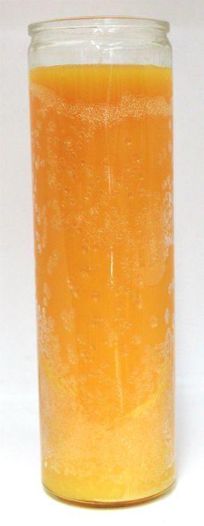 This candle comes in a clear and unmarked jar 8 1/4" x 2 1/2" with a single wick; it is filled to allow for melted wax to gather at the top on the initial lighting. It will burn continuously for 5-7 days.
