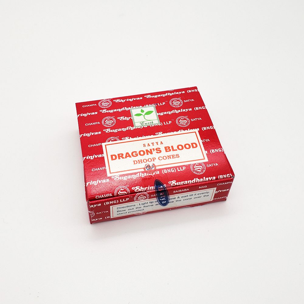Satya dhoop cone incense, dragon’s blood. 12 cones per box.
